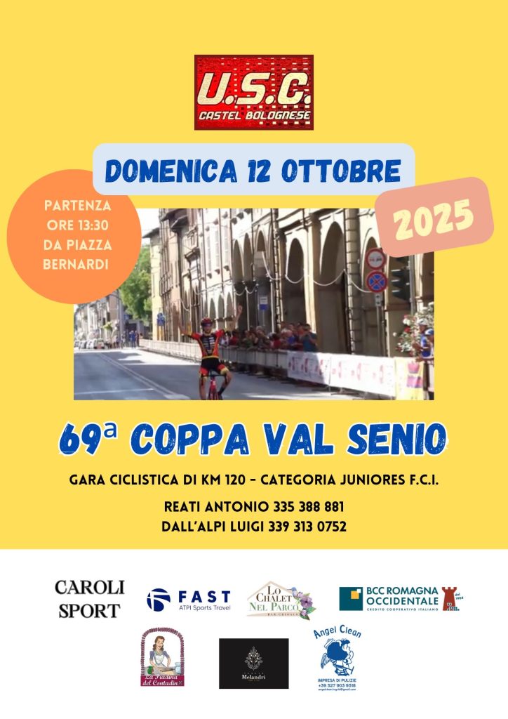 L’Associazione U. S. Ciclistica Castel Bolognese con il patrocinio del Comune di Castel Bolognese organizza la Coppa Valsenio gara ciclistica del campionato regionale di km. 120.